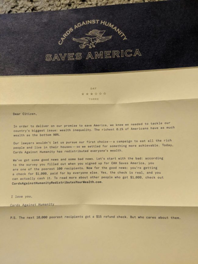 Los creadores de «Cards Against Humanity» enviaron una carta a los 100 donantes más bajos, informándoles sobre su situación económica y el cheque que recibirían. En la carta, se menciona: